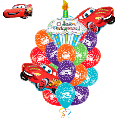 Детская именинная композиция "Тачки" из 20 латексных шариков,1 фигуры-торта и 2 фигур-тачек из мультфильма.