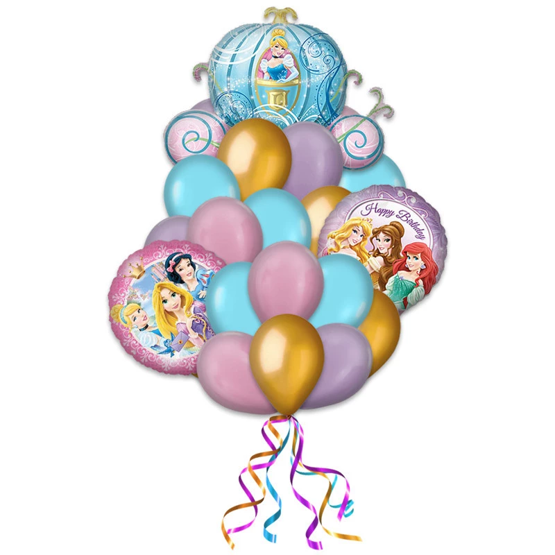 Букет «Карета Принцессы» состоящий из 1 фольгированной кареты для принцессы, 2 воздушных фольгированных шаров с принцессами и 22 воздушных латексных шаров пастельных тонов станет запоминающимся подарком для вашей именинницы и приятным украшением на День Рождения.