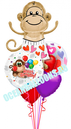 Букет "Обезьянка с поздравлением", состоящий из 6 фольгированных сердец, 2 фольгированных шаров-кругов с поздравлением и большой фольгированной фигуры Обезьянки, будет очень приятным и теплым подарком! Данная композиция станет очень прекрасным подарком в День Рождения и передаст всю теплоту Ваших чувств!