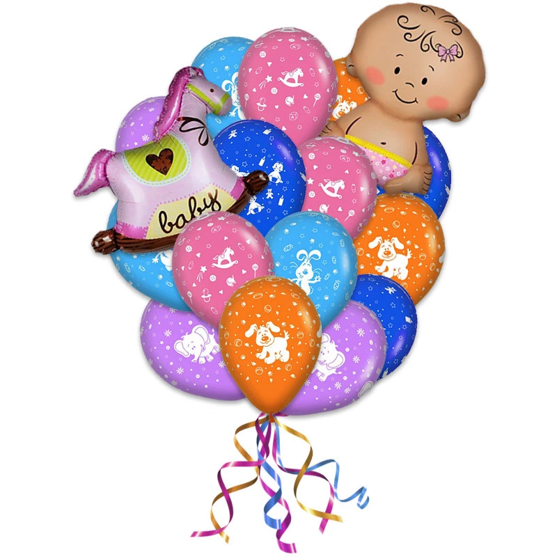 Букет «С рождением дочери» состоящий из 21 разноцветных воздушных латексных шаров с принтом, 1 фольгированной фигуры- лошадка качалка и 1 фольгированной фигуры малышки станет самым желанным подарком маме и подарит ярких эмоций и море позитива.