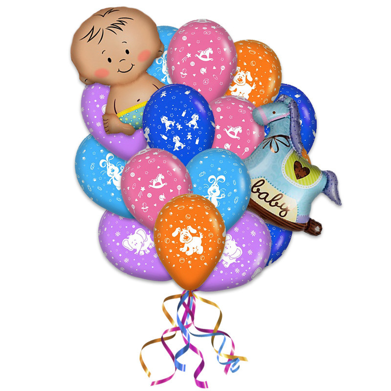 Букет «С рождением сына» состоящий из 25 разноцветных воздушных латексных шаров с принтом, 1 фольгированной фигуры- лошадка качалка и 1 фольгированной фигуры малыша станет запоминающимся подарком маме и подарит ярких эмоций и море позитива.