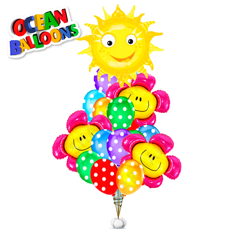 Композиция из 15 латексных шаров, и 4 фольгированных фигур в виде солнечной улыбки