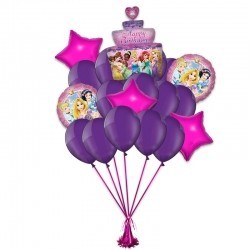 Изящный букет состоящий из 15 фиолетовых воздушных латексных шаров, 3 фольгированных звезд и 3 фольгированных шариков с принцессами идеальный подарок на День Рождения вашей принцессе.