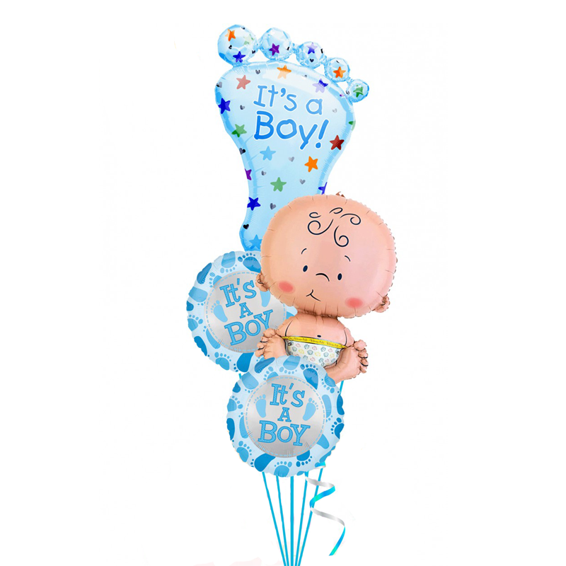 Композиция «Малыш» из 2 фольгированных воздушных шаров с надписью «it’s a boy», 1 фольгированной фигуры малыша и 1 фольгированной ступни мальчика станет запоминающимся подарком на рождения малыша, и принесет много положительных эмоций и радости в такой хороший день родителям.