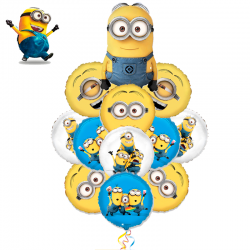 Букет "Миньоны", состоящий из 8 фольгированных шаров-кругов и 1 большой фольгированной фигуры в форме Миньона, подарит море радостных эмоций Вашему ребенку, а так-же станет неотъемлемой частью праздника и будет радовать своей красотой всех окружающих!