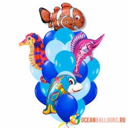 Облако "Мир океана" из 15 латексных шара в голубом, синем и белом цвете и 4 фольгированных фигур (2 подводные рыбы, рыба-меч и дельфин).