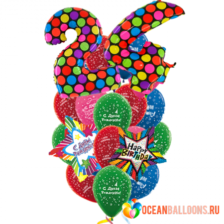 Композиция из 15 разноцветных латексных шаров с принтом "С Днем рождения", 2 фольгированных звезд с принтом "С Днем рождения" и 1-2 разных цифры на выбор размером 42/107 см.
