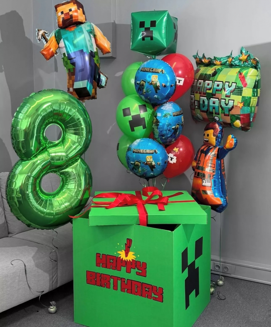 Коробка с шарами «Веселый майнкрафт» в интернет-магазине OCEAN BALLOONS. Заказать с доставкой! Тел.: +7 (495) 773-43-75.
