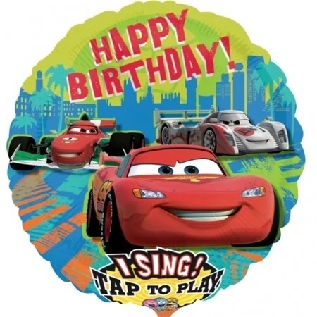 Крупный (d = 71см) музыкальный шарик в подарок мальчику по мотивам мультфильма "Тачки-2", принтованный его главными героями - МакКуином и другими машинками. Пришло время поучаствовать в настоящем Гран-При! Если шлепнуть по надутому шарику, начинается проигрывание одной из 3 английских фраз, которыми Оуэн Уилсон (актер, озвучивающий МакКуина в мультфильме) записал специально для производителя данной модели шара.